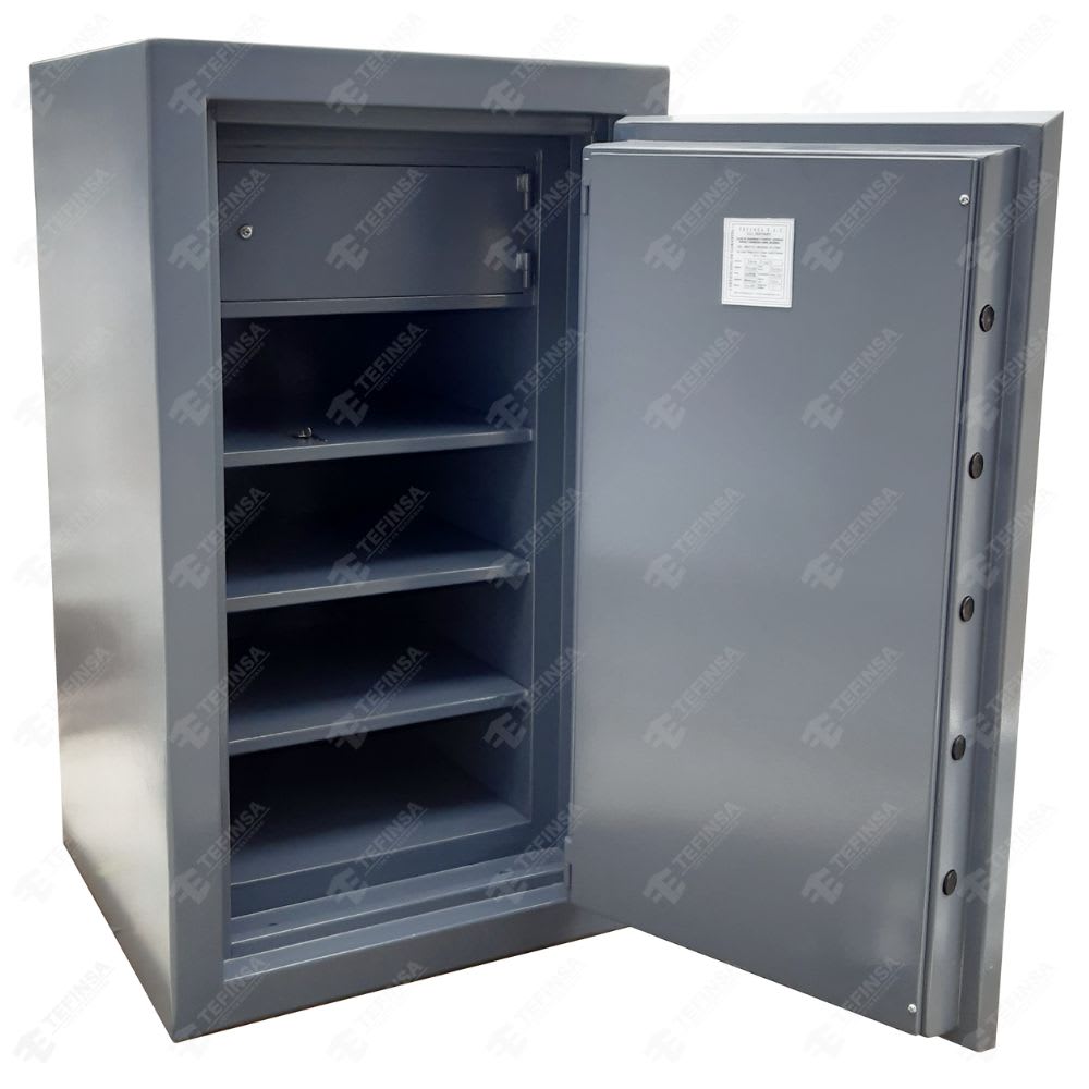 Construcción: La caja fuerte de pie tfs-110 de la marca Tefinsa está construida completamente con lámina de acero lacado de primera calidad de 1/8″ y puerta en 3/16″ de espesor. Además, cuenta con material refractario de alto poder aislante entre las paredes de la puerta y la caja, ofreciendo una resistencia al fuego de hasta 1200º C en 120 minutos (RF-120). Cada pieza está unida y soldada con soldadura eléctrica al arco o MIG MAG, garantizando la máxima seguridad. Sistemas de Cierre: El sistema de cierre incluye una cerradura digital americana, cerradura de llave y manija de acero. La caja fuerte también cuenta con orificios en la base inferior para su instalación. Pintado: Cada caja fuerte Tefinsa cuenta con dos manos de base epóxica y baño fosfotizante, garantizando la máxima durabilidad y protección contra la oxidación. Fabricadas en Perú, las cajas fuertes Tefinsa están diseñadas para ofrecer la máxima protección y seguridad para sus objetos de valor. No deje la seguridad de sus pertenencias al azar, confíe en la calidad y durabilidad de Tefinsa.