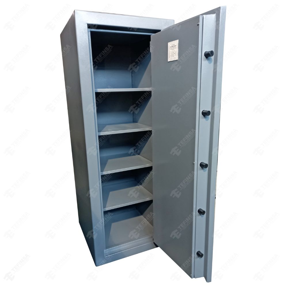 Construcción: La caja fuerte de pie tfs-160 de la marca Tefinsa está construida completamente con lámina de acero lacado de primera calidad de 1/8″ y puerta en 3/16″ de espesor. Además, cuenta con material refractario de alto poder aislante entre las paredes de la puerta y la caja, ofreciendo una resistencia al fuego de hasta 1200º C en 120 minutos (RF-120). Cada pieza está unida y soldada con soldadura eléctrica al arco o MIG MAG, garantizando la máxima seguridad. Sistemas de Cierre: El sistema de cierre incluye una cerradura digital americana, cerradura de llave y manija de acero. La caja fuerte también cuenta con orificios en la base inferior para su instalación. Pintado: Cada caja fuerte Tefinsa cuenta con dos manos de base epóxica y baño fosfotizante, garantizando la máxima durabilidad y protección contra la oxidación. Fabricadas en Perú, las cajas fuertes Tefinsa están diseñadas para ofrecer la máxima protección y seguridad para sus objetos de valor. No deje la seguridad de sus pertenencias al azar, confíe en la calidad y durabilidad de Tefinsa.