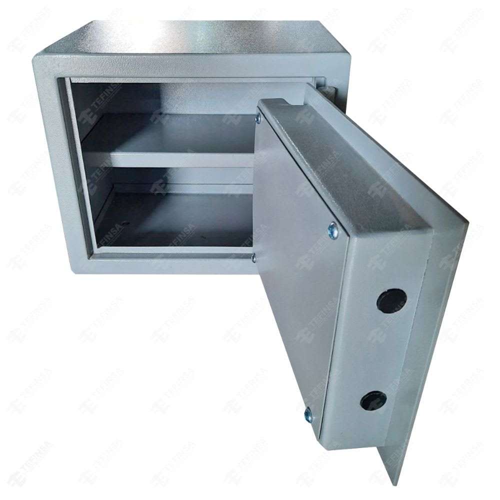 Construcción: La caja fuerte hotelera de la marca Tefinsa está construida completamente con lámina de acero lacado de primera calidad de 3/32″ y puerta en 3/16″ de espesor. Tanto la puerta como el marco cuenta con un cierre hermético para la no penetración de gases calientes al interior de la caja. Cada pieza está unida y soldada con soldadura eléctrica al arco o MIG MAG, garantizando la máxima seguridad. Sistemas de Cierre: El sistema de cierre incluye una cerradura digital americana y manija o timón de acero. La caja fuerte hotelera también cuenta con orificios en la base inferior para su instalación. Pintado: Cada caja fuerte hotelera Tefinsa cuenta con dos manos de base epóxica y baño fosfotizante, garantizando la máxima durabilidad y protección contra la oxidación. Fabricadas en Perú, las cajas fuertes hoteleras Tefinsa están diseñadas para ofrecer la máxima protección y seguridad para sus objetos de valor. No deje la seguridad de sus pertenencias al azar, confíe en la calidad y durabilidad de Tefinsa.