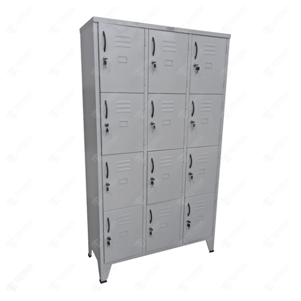 Locker metálico de 12 casilleros con tres columnas y cuatro filas de almacenamiento; perfecto para aquellos que necesitan una cantidad aún mayor de espacio de almacenamiento seguro. Hecho de acero resistente y duradero, que brinda seguridad para guardar tus pertenencias personales o artículos de valor. Ideal para su uso en una variedad de entornos, desde oficinas, escuelas, gimnasios, vestuarios, etc…. Todos nuestros lockers metálicos cuentan con garantía; además contamos con colores y acabados personalizados según sus necesidades.