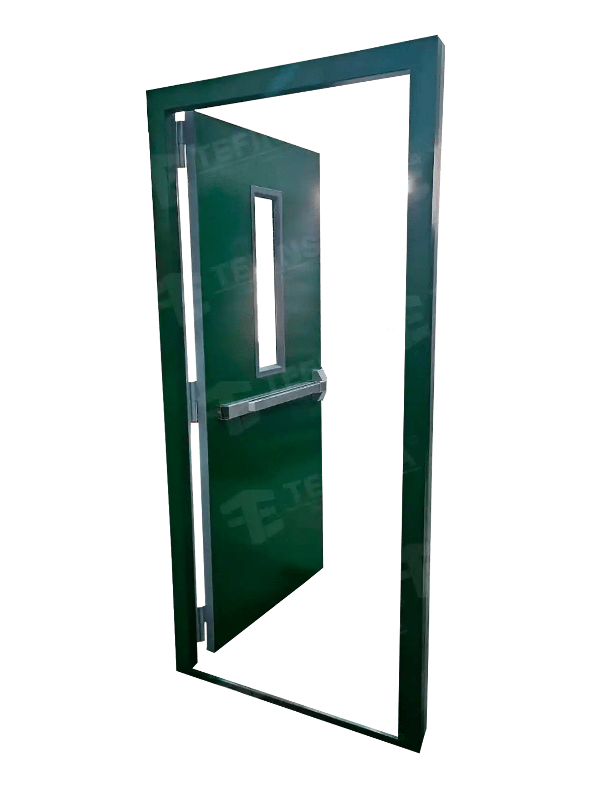 Puerta cortafuego verde, ideal para zonas industriales, comerciales o residenciales. Ofrece alta resistencia al fuego y un diseño funcional con acabado en color verde para señalización o estética ambiental.