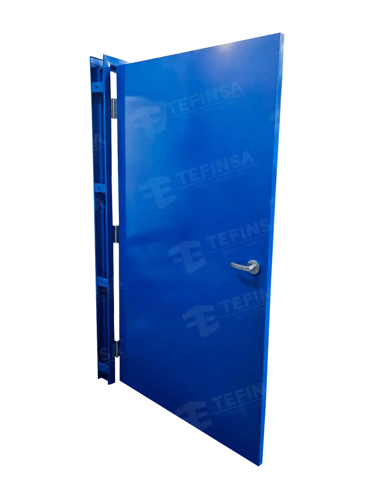 Puerta cortafuego azul, diseñada para proteger contra incendios en espacios industriales y comerciales. Resistente, segura y con acabado moderno.